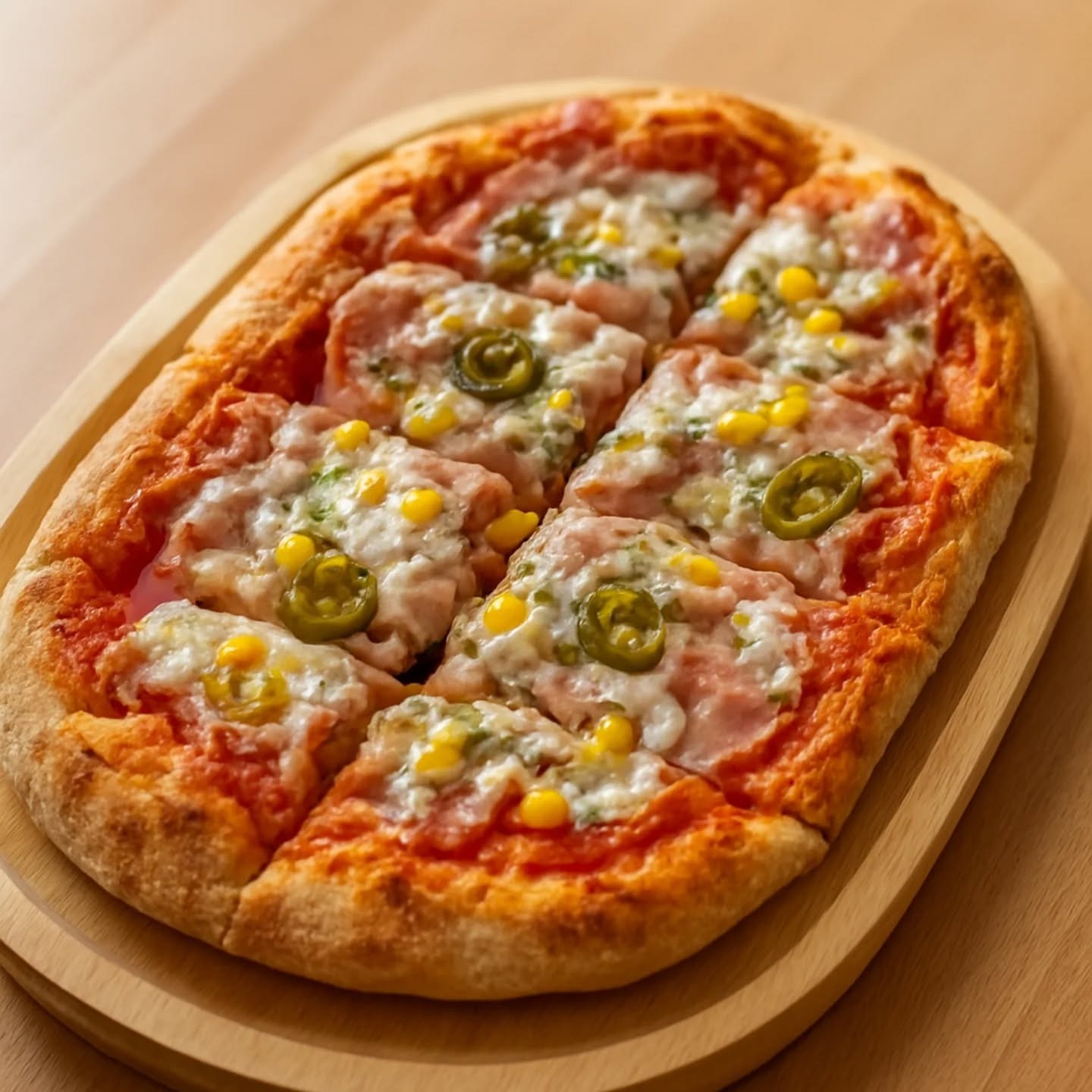 72h fermentované 200g cesto, paradajkový základ, syr 150g, pesto 30g, šunka 80g, kukurica 50g, -