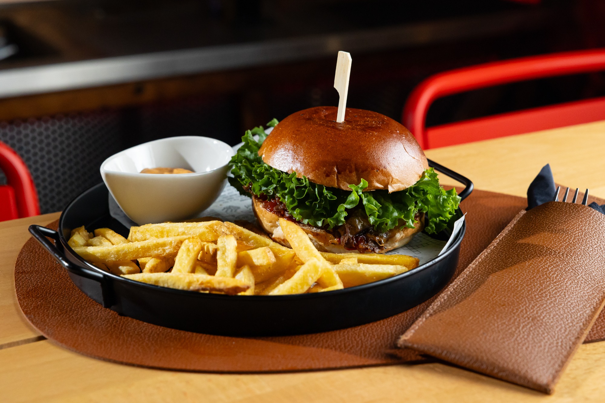 Maslová žemľa, paradajkový relish, trhané hovädzie mäso, cheddar, fermentovaná červená cibuľa, šalát, chipotle BBQ