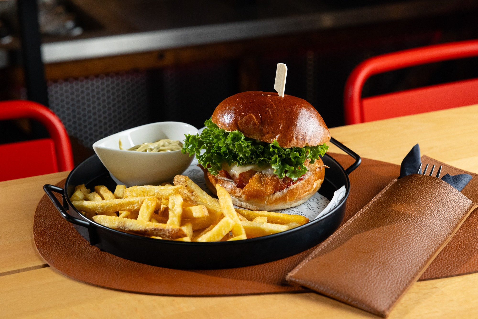 (MENU) Maslová žemľa, Hamburgrová majonéza, Nakladaná uhorka, Paradajka, 150g Chrumkavé kuracie filetky, Monterey jack syr, Šalát, Sladko-kyslá omáčka