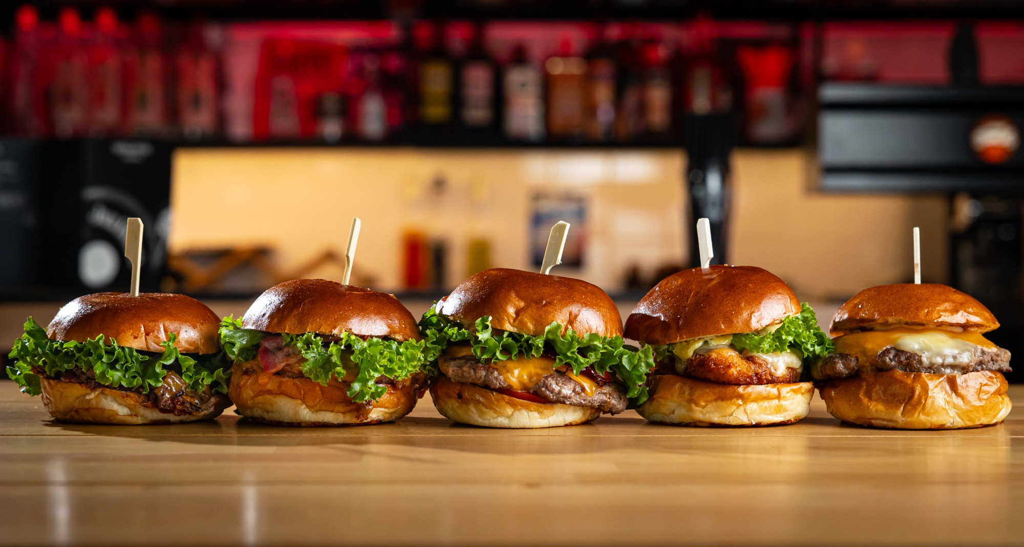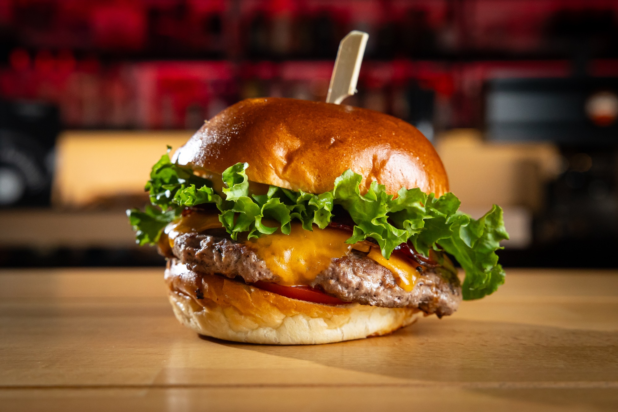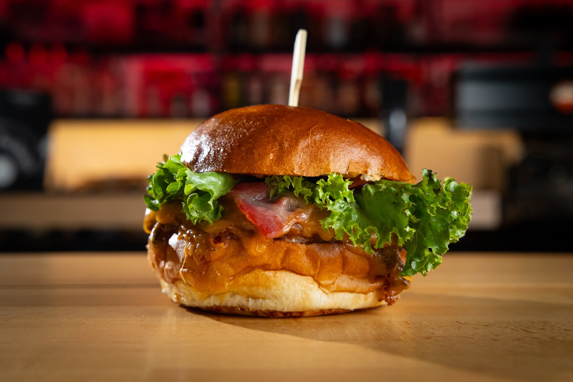 (MENU) Maslová žemľa, Haburgrová majonéza, Nakladaná uhorka, 150g vyzretý chuck roll, 2 plátky cheddar, 2 plátky Monterey jack, Fermentovaná červená cibuľa v Legenda pive, Slaninová omáčka