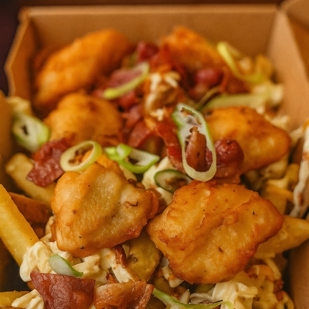 400g poctivých chrumkavých hranoliek zapekaných pre ešte väčší pôžitok z chuti., 150g pomaly pečené bravčové plece v kajanskej omáčke, Cheddar, Sri racha, Majonéza, Slaninka, Pór, Smažená cibuľka
